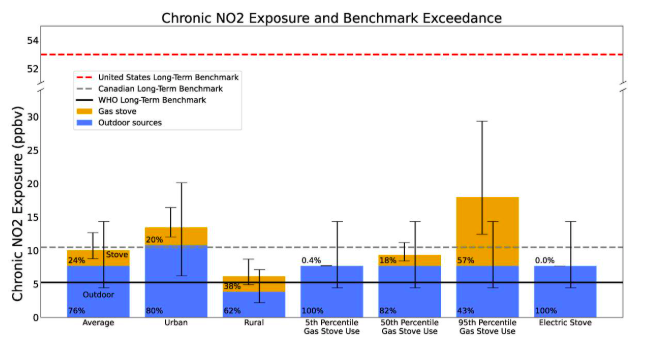 Exceso de los valores de referencia de NO₂ a largo plazo atribuible a estufas por condado y población. Condados de EE. UU. (mapa, izquierda) y población de EE. UU. (barra, derecha) que superan la directriz de exposición a NO₂ a largo plazo de la OMS : el azul indica los condados donde la exposición residencial promedio atribuible al aire libre, por sí sola, supera la directriz a largo plazo de la OMS, independientemente de las fuentes de contaminación en interiores; el magenta indica los condados donde la exposición residencial atribuible al aire libre, por sí sola, es inferior a la directriz de exposición, pero la adición de la exposición a estufas de gas aumenta la exposición residencial total por encima de la directriz de la OMS; el verde oscuro indica los condados donde la suma de la exposición promedio atribuible al aire libre y a estufas se mantiene por debajo de la directriz de la OMS. Las barras de error a la derecha representan los IC del 95 %.