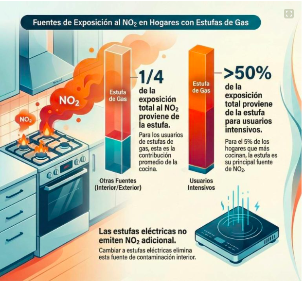 El trabajo, publicado el 2 de diciembre en PNAS Nexus, muestra que sustituir una cocina a gas por una eléctrica disminuye la exposición personal a NO₂ en más del 25% en promedio y hasta la mitad en los hogares que usan más el fogón. Una rebaja nada menor si se considera que el NO₂ se asocia a asma, enfermedad pulmonar obstructiva, partos prematuros y ciertos cánceres. Y que el gas también libera benceno, un carcinógeno de sobra conocido.