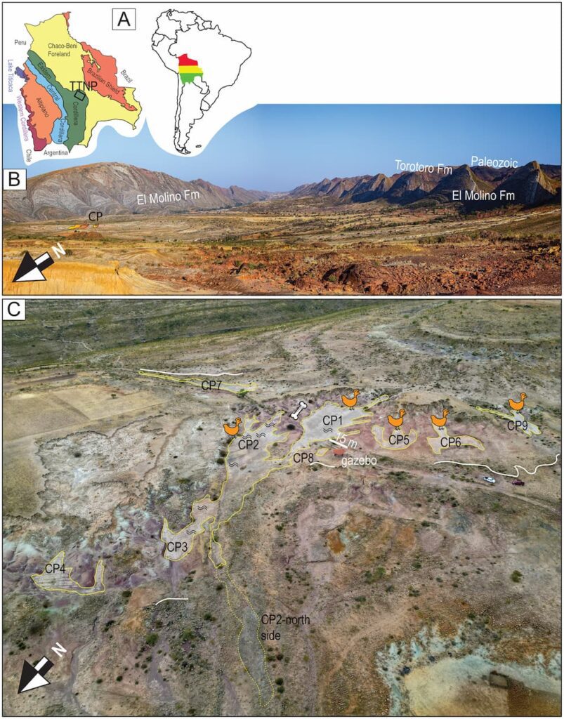 A) Mapa de Bolivia en el que se muestran las principales regiones geológicas. El cuadrado negro destaca la ubicación del Parque Nacional Torotoro (TTNP) dentro de la Cordillera Oriental. B) Vista aérea desde un dron del sinclinal de Torotoro desde el noroeste. Se indican las principales formaciones geológicas. El yacimiento de huellas de Carreras Pampa está marcado como CP. C) Vista aérea desde un dron del yacimiento de huellas de Carreras Pampa con los yacimientos marcados como CP1-CP9. Una barra blanca mide 15 m de largo, lo que corresponde a la longitud de la pared lateral de la pasarela. Hay dos camionetas pickup situadas en el lado derecho, cerca del sitio CP6. Los iconos naranjas con forma de pájaro indican el área aproximada de las huellas de aves. El símbolo de la ola indica las regiones con las ondulaciones más notables, aunque se encuentran en todo el lecho de huellas expuesto. La línea blanca indica dónde se revela la capa que contiene las huellas en una sección transversal vertical. Crédito: R. Esperante et al., 2025