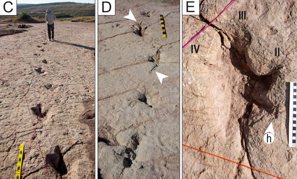 C) Huellas profundas de la pista T22-2-25. D) Conjunto de cinco huellas muy profundas de la pista TS102. Las flechas blancas indican rastros de cola. E) Huella L10 de la pista T22-126. Los dígitos están marcados con los números II, III y IV. h = hallux. Las escalas en C y D son en secciones de 10 cm, y la escala en E es de 20 cm. Crédito: R. Esperante et al., 2025